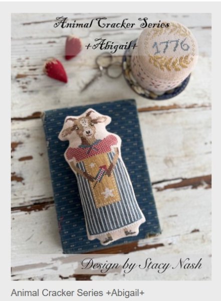 Pre-Order! This item will be released during the Nashville Wholesale Market and will ship mid to late March. Please order items you need sooner separately from this item. Abigail is the title of this cross stitch pattern from Stacy Nash Primitives Animal Cracker Series.