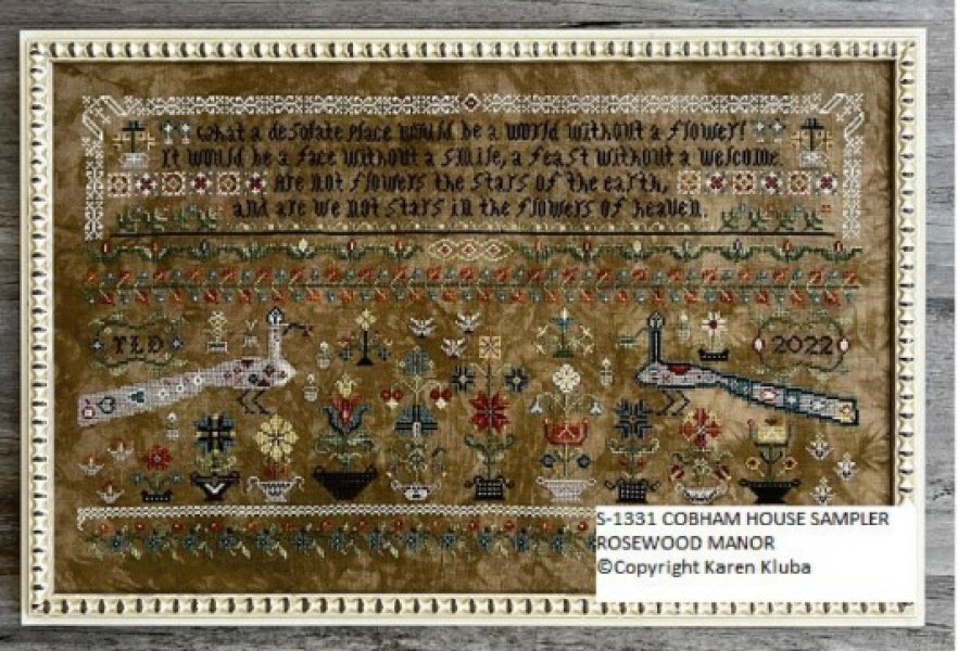 Cobham House Sampler is the title of this cross stitch pattern that is stitched with Weeks Dye Works fibers (Light Khaki/2, Pebble/2, Blue Spruce/2, Charcoal/3, Ivy/2, Gold/2, Terra Cotta/2, Red Rocks, Cheaspeake, Teal Frost/2). This is a 14 page booklet that includes the sampler as shown in the photo and ten smalls.