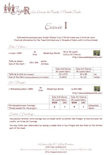 Essuie I is the title of this cross stitch pattern from GiGi R Designs that you finish as a towel or even framed. Personalization is not included in the chart other than what is shown in the photo. You can purchase seperately GGR Designs (Letters) that is sold elsewhere on the website.