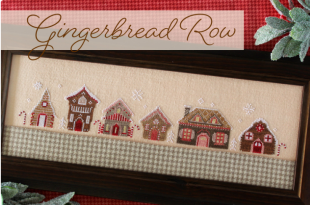 Gingerbread Row is the title of this cross stitch pattern from October House Fiber Arts that is stitched with Classic Colorworks (Blushing Beauty, Crab Cakes, Brown Hen, Country Lane), Gentle Art Sampler (Baked Clay) and Weeks Dye Works (Louisiana Hot Sauce, Hazelnut, Chickpea, Whitewash, Goldenrod, Cocoa).