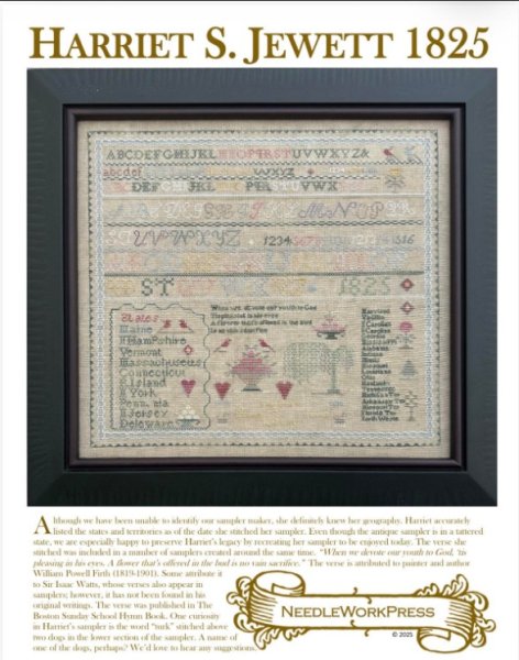 Pre-Order! This item will be released during the Nashville Wholesale Market and will ship by mid to late March. Please order items you need sooner separately from this item. Harriet S Jewett 1925 is the title of this cross stitch pattern from Needle WorkPress.