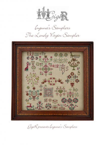 The Lonely Virgin Sampler is the title of this cross stitch pattern from GiGi R (Iguana's Samplers) that is stitched with Gentle Art Sampler threads (Rose Garden/2, Chives/2, Babyberry/2, Grasshopper, Pine, Grecian Gold) and Classic Colorworks (Straw Hat, Cayenne and Blackbird which is only used minimally so DMC 310 will work as well).