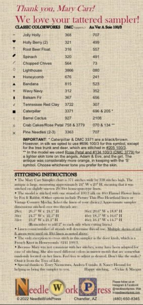 Mary Carr 1840 is the title of this cross stitch pattern from Needle WorkPress. The second photo shows the options you can use in fabrics and fibers. Click on the images to enlarge the photos.