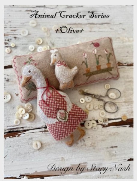 Pre-Order! This item will be released during the Nashville Wholesale Market and will ship by mid to late March. Please order those items you need sooner separately from this item. Olive is the title of this cross stitch pattern from Stacy Nash Primitives.
