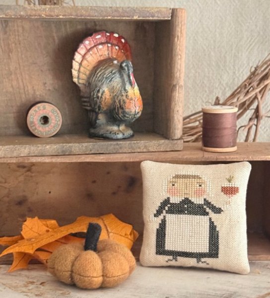 Pre-Order! Please order items you need sooner separately from this item as your overall order will not ship until this item is in stock. Priscilla is the title of this cross stitch pattern from Notforgotten Farms' Littles Series. She is all ready for Thanksgiving holding her beet and ready to cook. Here is the link to her companion John.