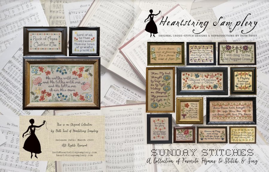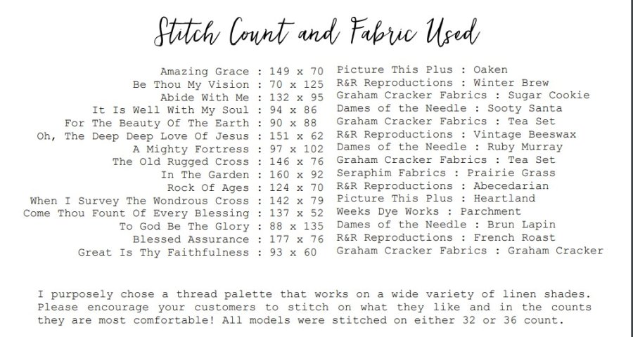 Sunday Stitches is the title of this booklet from Heartstring Samplery that contains 15 designs for the most loved hymns. Released earlier as standalone charts, this booklet contains those original 12 designs plus 3 new ones. This is sure to be a collectible or even a wonderful gift for a stitching friend. Attached are two files with the fabrics and fibers used along with stitch counts. Clicking on the photos will enlarge the designs and information for easier reading.