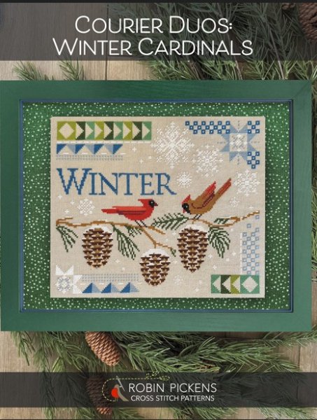 Pre-Order! This item will be released during the Nashville Wholesale Market and will ship mid to late March. Please order those items you need sooner separately from this item. Winter Cardinals is the title of this cross stitch pattern from Robin Pickens that is stitched with DMC threads.