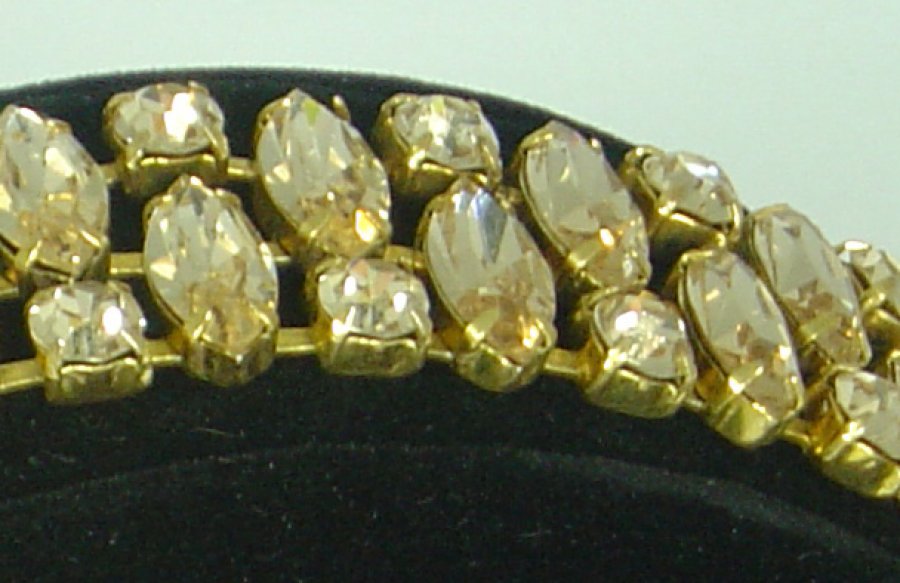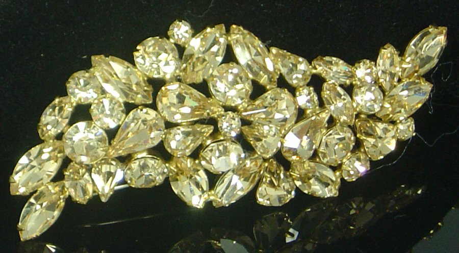 A Regency vintage three piece parure set in golden colored rhinestones in a gold toned setting. The brooch is marked "Regency" and measures 4" in length and and 1.5" at its widest. The bracelet measures 7" in length and has a guard chain and is also marked "Regency". The clip-on earrings measures 1.5" in length and the clip on spring mechanism is tight and good condition.